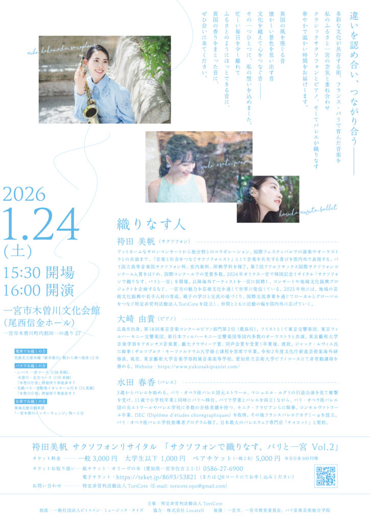 2026年1月24日(土)、一宮市木曽川文化会館にて、帰国後2回目となるリサイタル「サクソフォンで織りなす、パリと一宮 vol.2」を開催します。